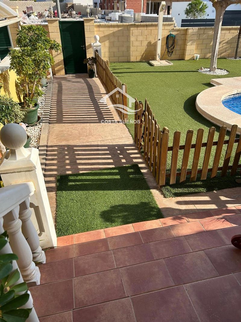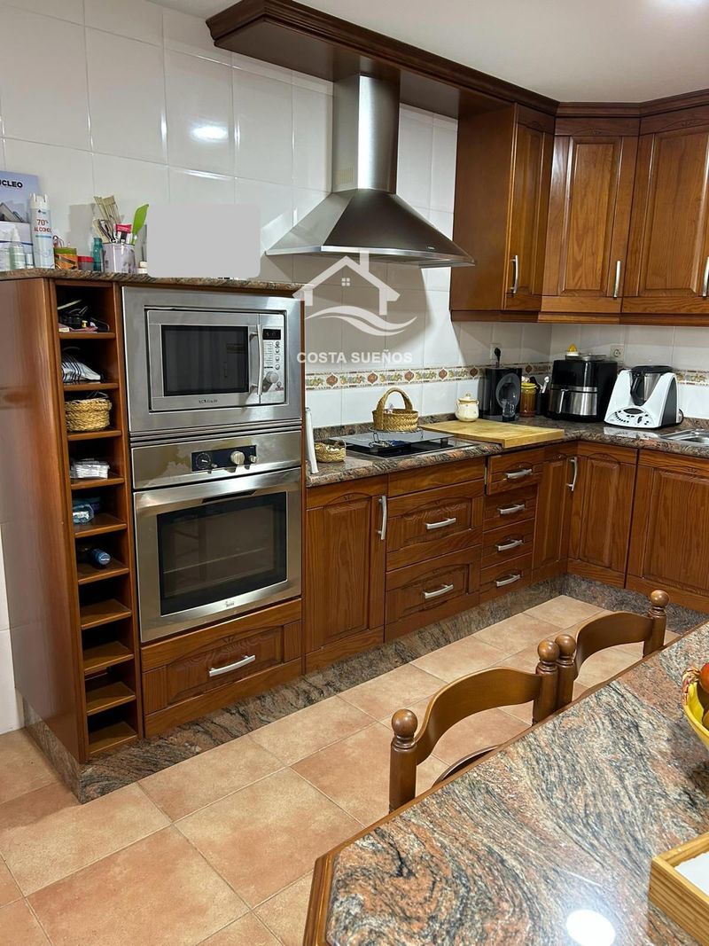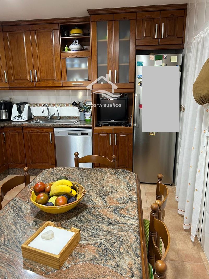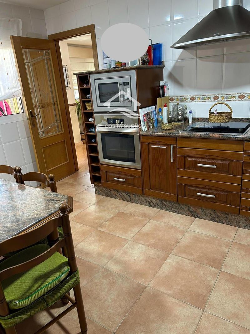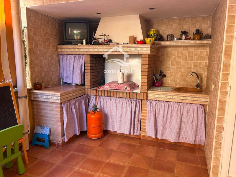 La cocina es independiente, muy amplia y completamente amueblada, con acceso directo a una galería ideal como zona de lavado o despensa. En esta planta también se encuentra un aseo de cortesía, una estancia adicional con barbacoa cubierta y toldos, perfecta como comedor de verano o zona de reuniones, y todas las paredes lisas, aportando un toque moderno y limpio al ambiente.